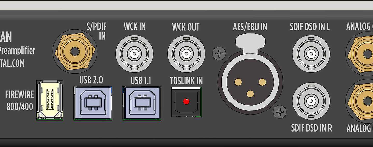 Примерно так выглядит полный набор цифровых входов у серьезного ЦАП. Здесь приведено схематическое изображение модели Mytek Manhattan, у которой помимо стандартного набора присутствуют разъемы для внешнего сигнала синхронизации и Firewire