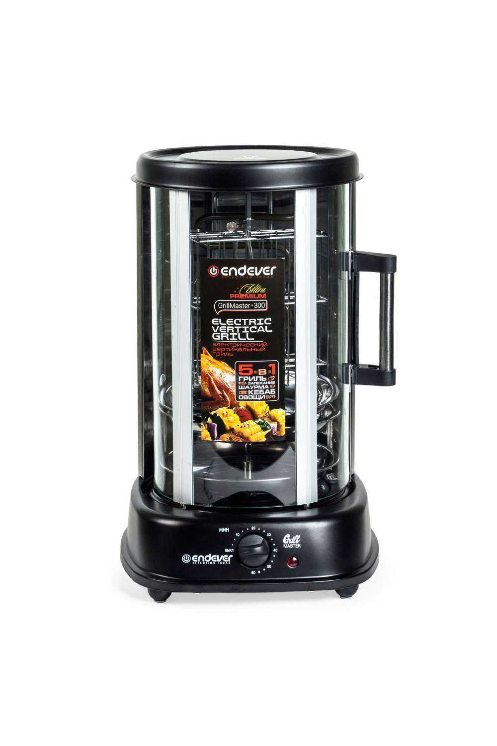 Вертикальная модель, позволяющая очень быстро приготовить большое количество вкусного и сочного мяса. Мощность устройства — 1400 Вт. Производители оснастили прибор поворотным столом-поддоном, поэтому жар от ТЭНа равномерно пропекает продукты со всех сторон. За один раз можно приготовить шесть порций мяса. Корпус выполнен из металла и также состоит из съемных элементов. Безусловным преимуществом модели является наличие светового индикатора, по которому можно отслеживать процесс нагрева и работы устройства.
