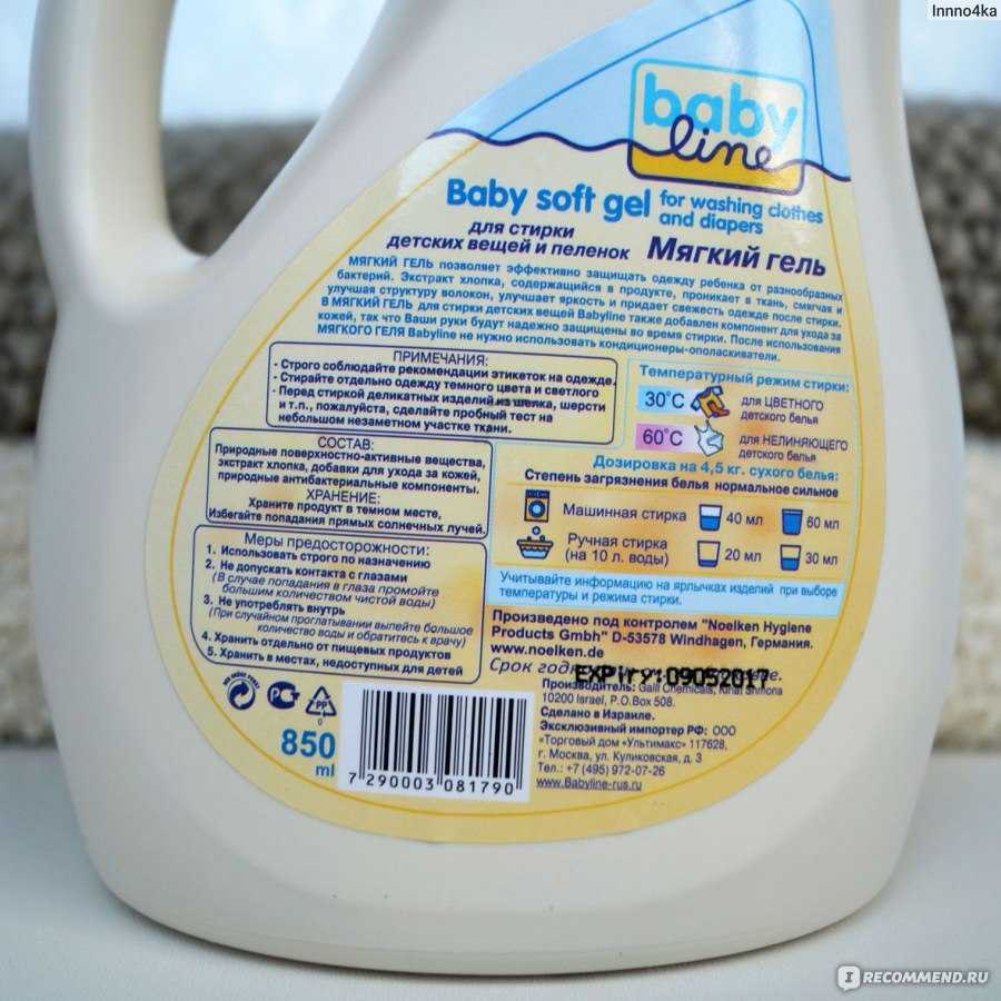 - BabyLine. Страна: Израиль. Цена: около 500 руб. В составе: очищенная вода, природные ПАВ – менее 10%, антибактериальные компоненты природного характера, экстракт хлопка. Преимущества: подходит для стирки вещей новорожденных, отлично отстирывает, не оставляет желтизны, выполаскивается хорошо, пахнет приятно, экономичен.