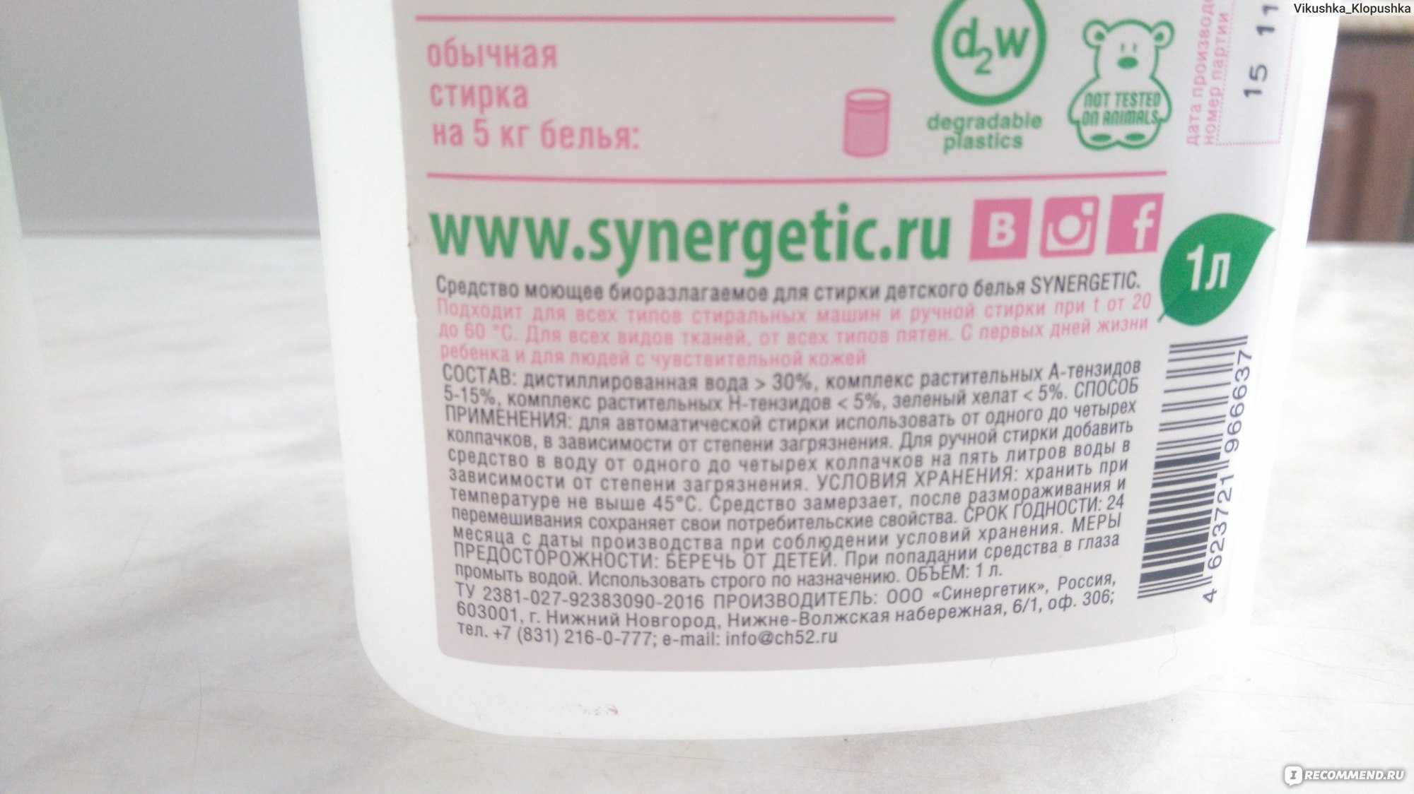 - Synergetic – бренд, под которым производится безопасная бытовая химия, в том числе и для детей. Его гели вымываются из тканей на 100%, что исключает неприятные ощущения после стирки. Они подходят для применения как вручную, так и в стиральных машинках любого типа. Концентраты безопасны для техники и не дают образовываться коррозии, в их состав входят натуральные компоненты – масла, глицерин, дистиллированная вода. Это сводит к минимуму вероятность возникновения аллергии как у взрослого человека, так и у ребенка.
