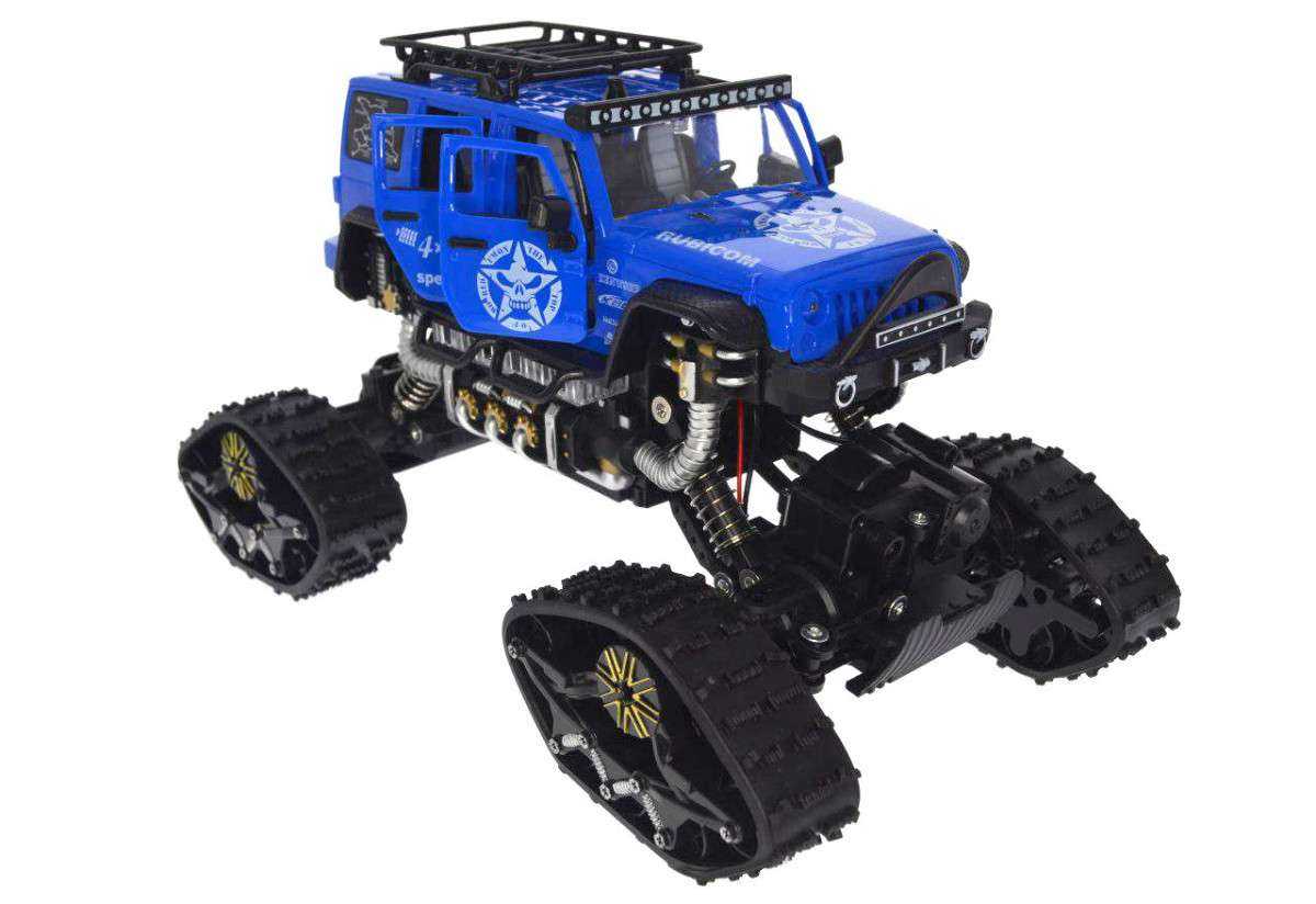 Этот радиоуправляемый внедорожник может ездить на гусеницах и на колесах! Такая машина не знает преград. На гусеницах внедорожник превращается в вездеход и развивает скорость 3 км/ч. В такой конфигурации автомобиль спокойно может ехать по снегу или песку, карабкаться через корни деревьев и камни. Если на внедорожник установить колеса, он превратится в «паркетник», который будет мчаться по асфальту со скоростью 7 км/ч. Мосты радиоуправляемого внедорожника опираются на пружинные амортизаторы, в рулевом механизме применен сервомеханизм. Кузов модели копирует очертания автомобиля Jeep Wrangler, можно открыть все двери и заглянуть в салон. Во время движения под днищем кузова светится яркая светодиодная подсветка, которая освещает детали подвески и дорогу под ней. Удобный пульт управления позволяет устраивать заезды с друзьями, не создавая друг другу помех, и обеспечивает дальность управления до 50 метров. NiCD аккумулятор заряжается за 2.5-3 часа и позволяет наслаждаться внедорожными приключениями примерно 15 минут.