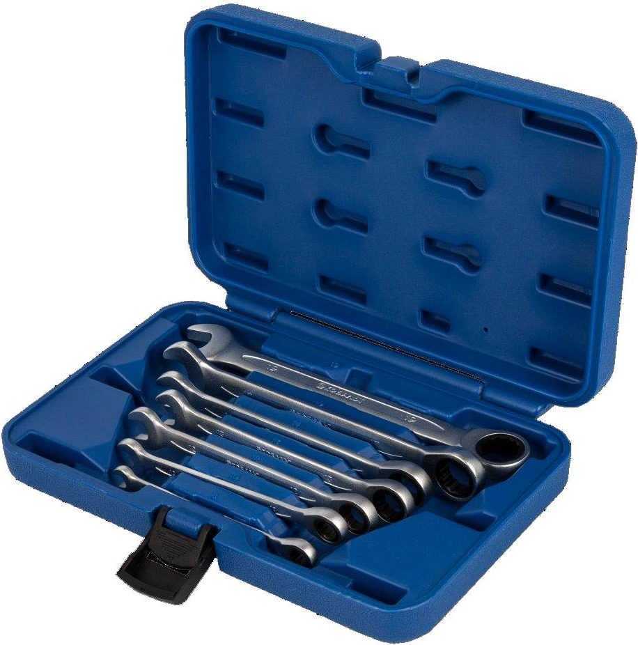 Набор сделан из крепкого сплава стали, что делает ключи устойчивыми даже перед внушительной нагрузкой. Кольцевидный наконечник снабжен механикой, типа храповая, поэтому производительность работы при помощи вспомогательной головки существенно возрастает. В сборке доступны 7 экземпляров, чей размерный диапазон составляет от 8 до 19мм., комплектуется кейсом устойчивым перед механическими повреждениями и снабженным надежным замком. Подобный подход к изготовлению кейса обеспечивает безопасность при переноске инструментов и благоприятные условия для содержания. В продаже встречается по средней стоимости от 3990 руб.
