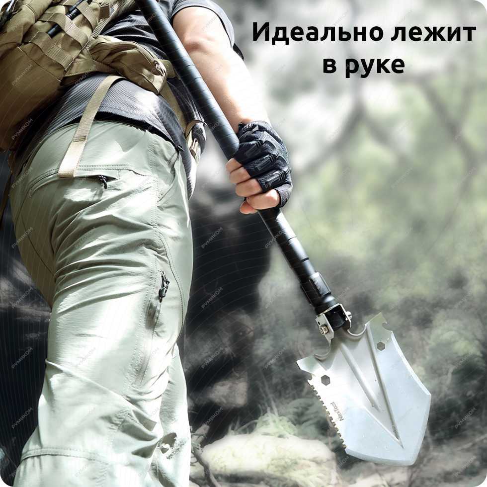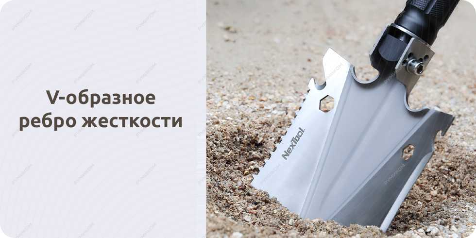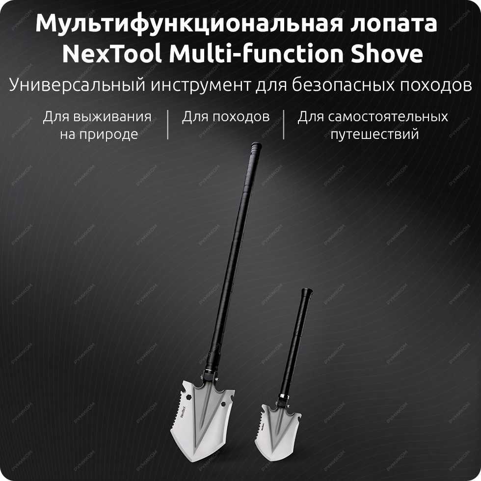 Во многофункциональной лопате Nextool кроме самой лопаты уместились мотыга, крюк, пила, отвертка, огниво, молот, компас, свисток и еще несколько инструментов, делающих ее незаменимым инструментом для выживания в дикой природе, а также для походов, самостоятельных путешествий и других занятий на открытом воздухе, где может понадобиться столь полезный инструмент.