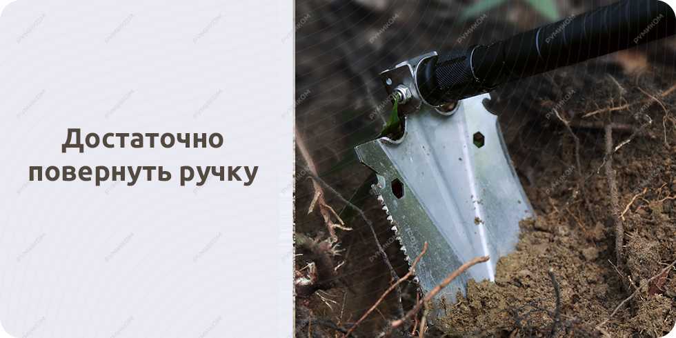 Достаточно повернуть ручку, чтобы ослабить крепеж, и из лопаты можно моментально сделать мотыгу. Ее угол наклона в 85° относительно ручки подобран с учетом требований эргономики, а ручка длиной 76 см не требует сильно наклоняться во время работы.