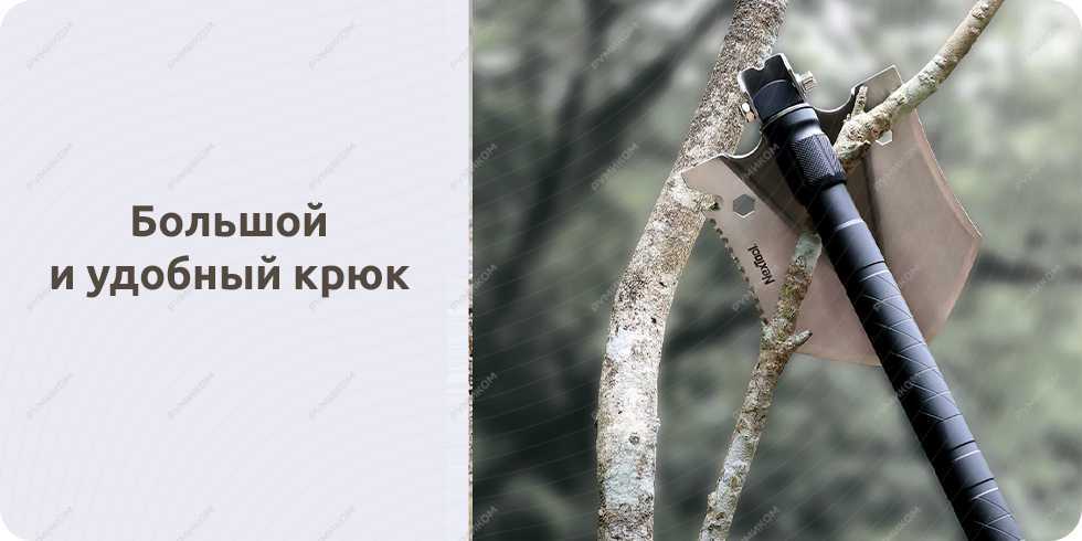 Если полотно лопаты установить на 30° относительно ручки, можно получить большой и удобный крюк, который достанет до высоких веток, поможет преодолеть сложные препятствия или собрать хворост для костра.