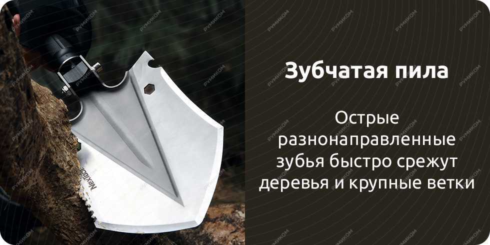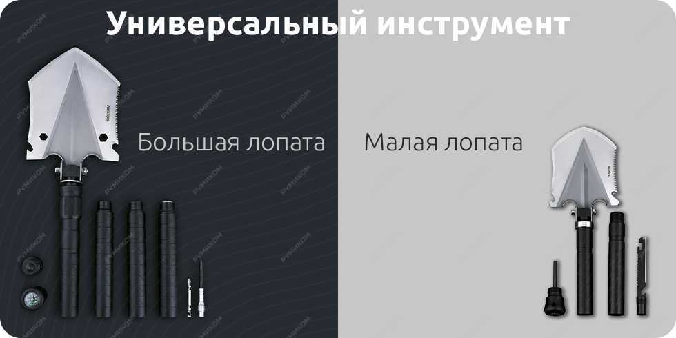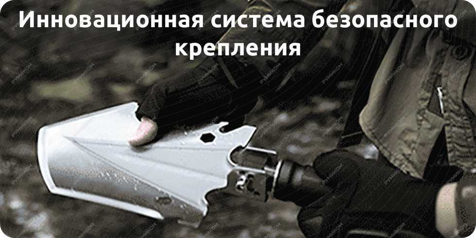 - лопата Shovel – со сборной метровой ручкой, насадкой-компасом для верха рукоятки со стеклобоем с обратной стороны, возможностью изменения уровня изгиба штыкового лотка относительно черенка под нужным углом и ножовкой-пилой в роли одной из боковых граней полотна.