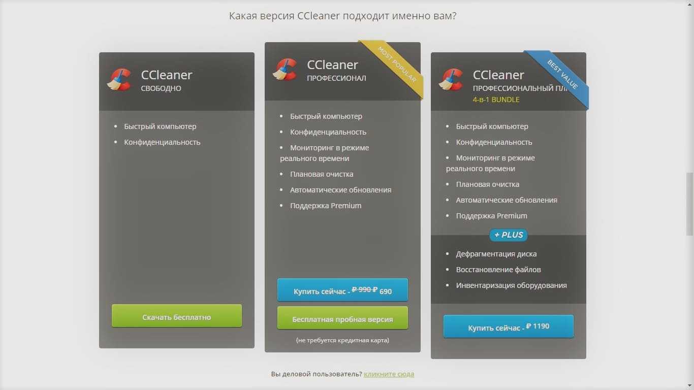 CCleaner Business Edition – бизнес-версия программы, предназначена для компаний и учреждений. Подходит для коммерческого применения. Премиум бизнес-поддержка в комплекте.