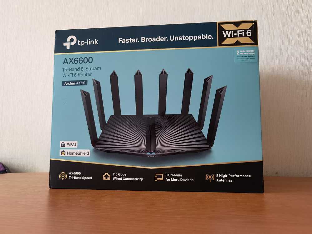 Конечно, в комплекте TP-Link Archer AX90 ничего сверхъестественного нет. Маршрутизатор упакован в действительно большую коробку, которая традиционно изготавливается из картона, но состоит из двух слоев: наружного в типичном для производителя бирюзовом цвете с изображением товара и его важнейшими характеристиками, и жесткая внутренняя коробка в белом цвете, для более надежной защиты изделия.