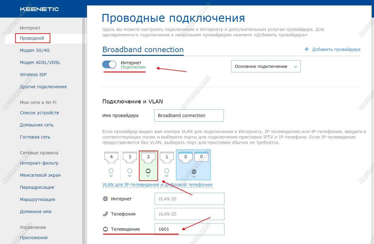 Открываем раздел «Интернет» -> «Проводной». Здесь собраны все основные параметры для кабельного соединения и сопутствующих ему сервисов
