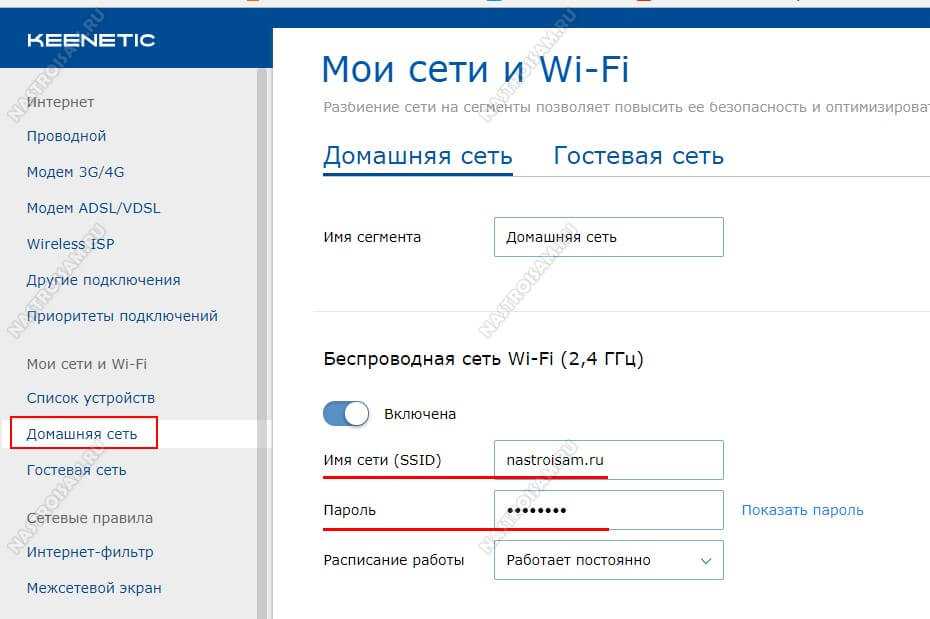 Настройка сети Вай-Фай на роутере Кинетик Гига в прошивке 2.12 и выше выполняется в разделе «Мои сети и Wi-Fi» -> «Домашняя сеть»: