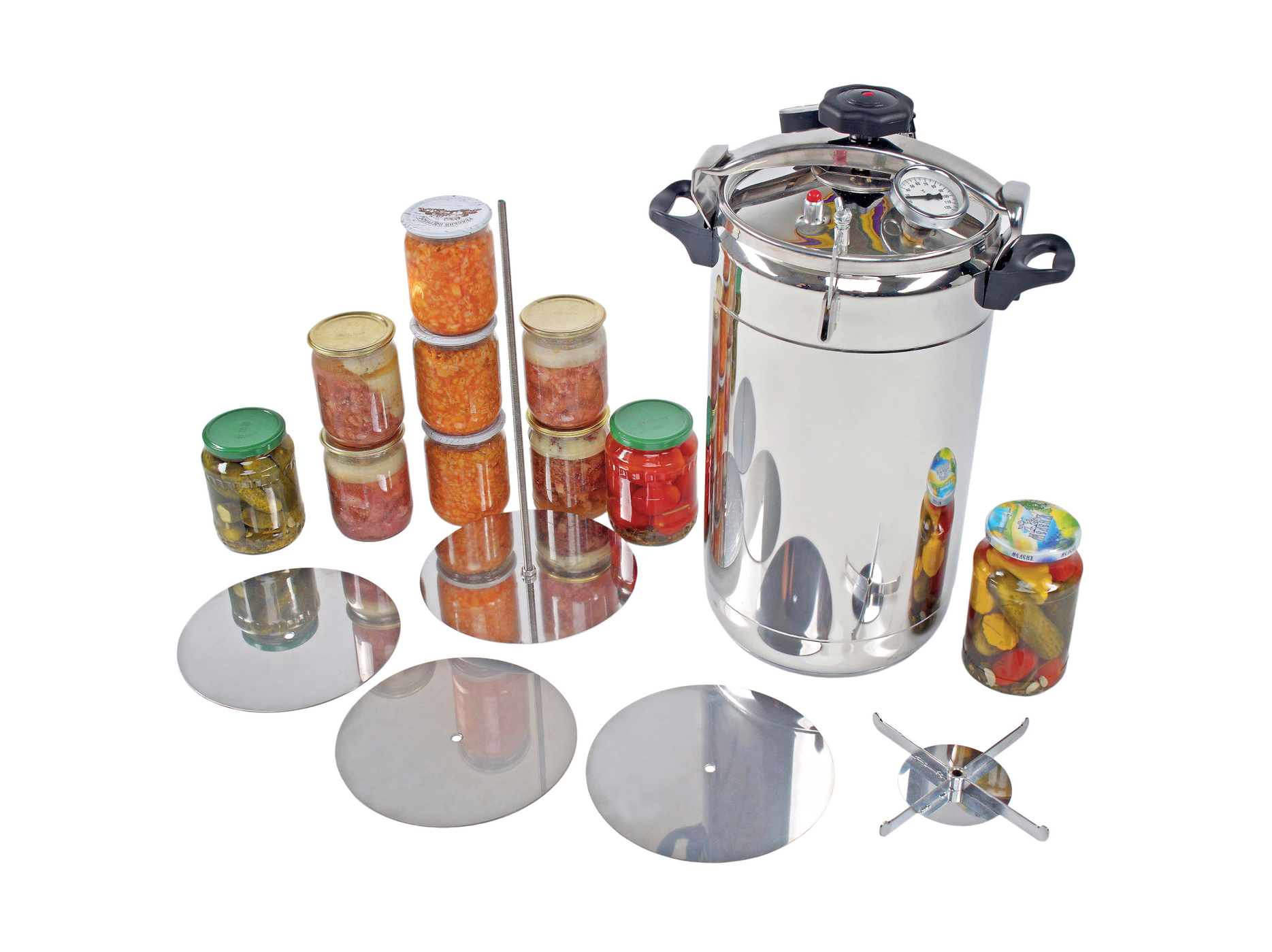 Несмотря на то, что это все же самогонный аппарат, назвать его таковым не всегда получится. Дело в том, что «Первач Супер-элит» немного модернизировали и получили полноценный автоклав с функцией дистилляции воды – 2в1. Решение вполне разумное: для этого потребовалось лишь установить манометр давления, добавить в комплект заглушку для закупоривания отверстия дистиллятора и кассету для установки 12 пол-литровых или 6 литровых банок.