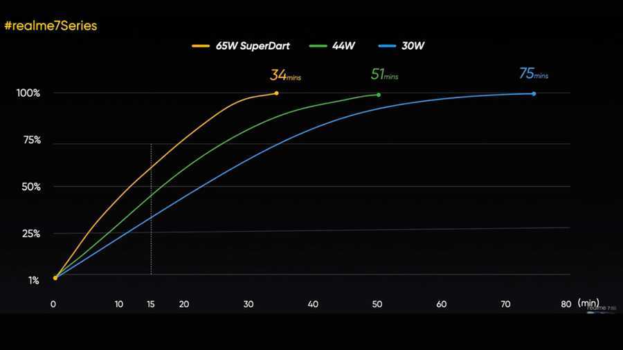 На презентации седьмой линейки смартфонов не преминули похвалиться перспективной 125-ваттной зарядкой UltraDart, которая за 3 минуты заливает 33% емкости. Однако Realme 7 Pro получил только 65-ваттную SuperDart, при этом напомним, что моделям из шестой линейки пришлось довольствоваться вообще 30-ваттной Flash VOOC 4.0. По сравнению с предшественником – Realme 6 Pro – емкость аккумулятора у Realme 7 Pro увеличилась с 4 300 мА*ч до 4 500 мА*ч. Благодаря мощному адаптеру SuperDart (10 В/6,5 А), всего трех минут зарядки хватает, чтобы затем 2,5 часа смотреть ролики на YouTube, или 2 часа листать фото в Instagram, или пройти три раунда PUBG Mobile.