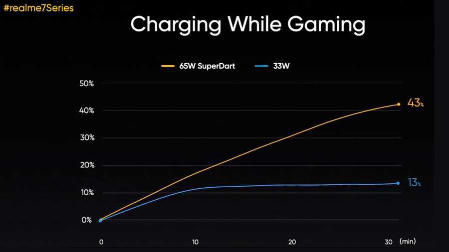 Даже если играть во время зарядки, уже через полчаса уровень накопленной энергии достигнет 43%, а в случае использования 33-ваттного адаптера не поднимется выше 13%. Говорят, что при высоком токе и относительно низком напряжении запуск даже «тяжелых» приложений вроде бы не наносит вреда аккумулятору. Мониторинг температуры на основной и дополнительной платах Realme 7 Pro осуществляет «умный» 5-ядерный чип, получающий информацию от 10 датчиков. На презентации отметили, что эффективность процесса зарядки достигает 98%, а температура при этом не превышает 40 градусов.