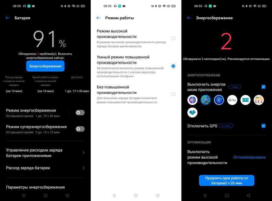 В разделе «Батарея» предлагается воспользоваться советами по оптимизации энергосбережения, а также на соответствующей вкладке определиться с подходящим режимом работы – «Режим высокой производительности», «Умный режим повышенной производительности» (по умолчанию) или «Без повышенной производительности».