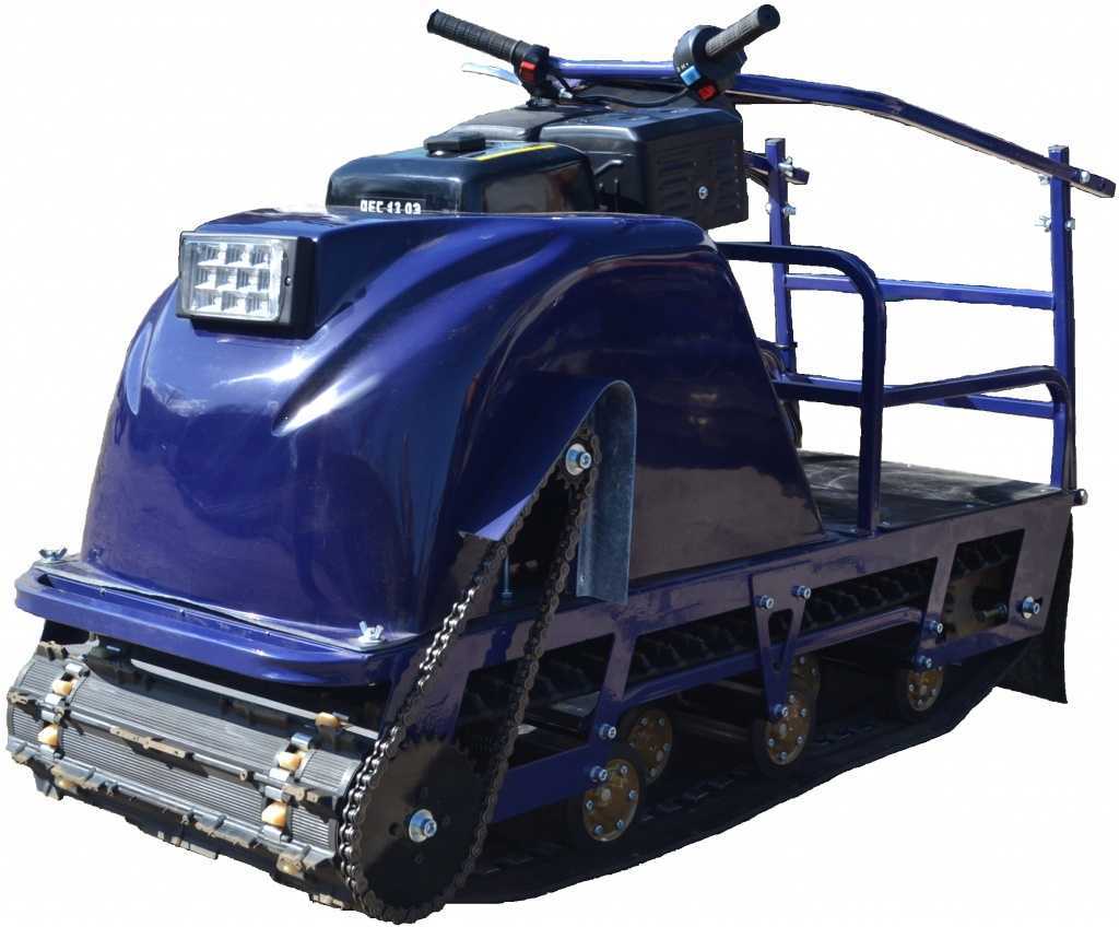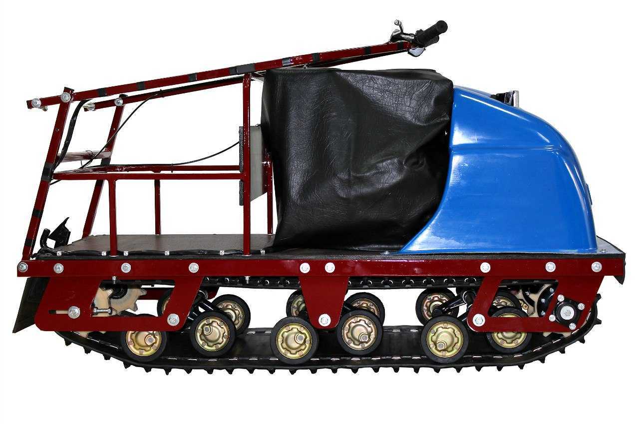 Модель небольшая, но ее грузоподъемность достигает 250 кг. Столь неплохая производительность возможна благодаря широкой гусенице (50 см) и мотору на 13 л.с. Еще здесь приваренные багажники и вспомогательные ребра жесткости повышают прочность рамы.