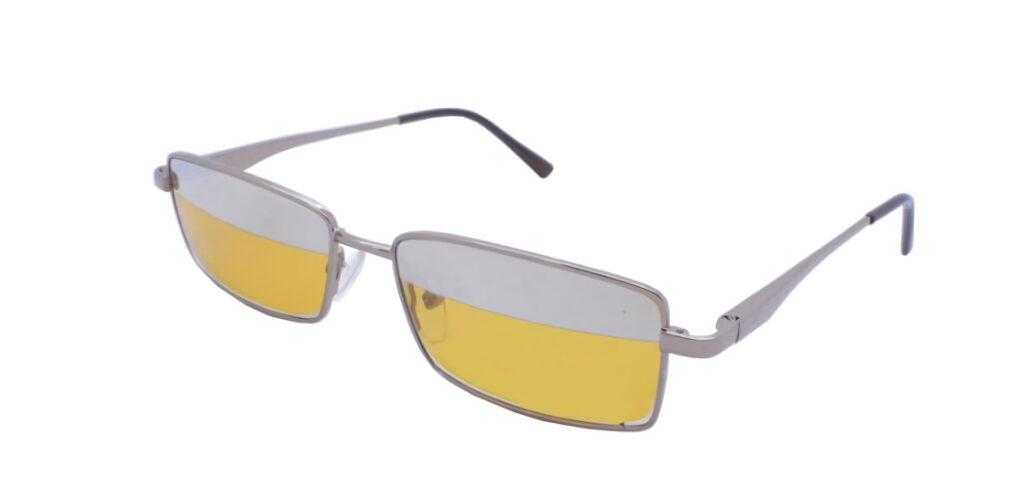Ободковая конструкция выполнена из металла серебристого цвета. Она отличается складной формой дужек, возможностью регулировки носовых упоров. Линзы здесь желтого цвета, прямоугольные, из стекла. Поверх них находится антибликовое напыление, тонировка для коррекции цветов.