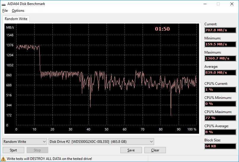 На втором тесте производительность заметно падает, а значит массивные данные передаваться и считываться будут медленнее. Тем не менее показатели все равно очень неплохие. Тем более, что речь идет о накопителе небольшого объема, тогда как для дисков SN550 объемом в 500 гигабайт и выше заявлены куда более внушительные скорости.