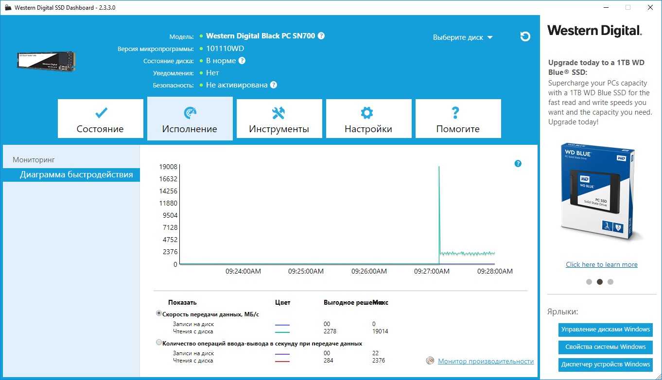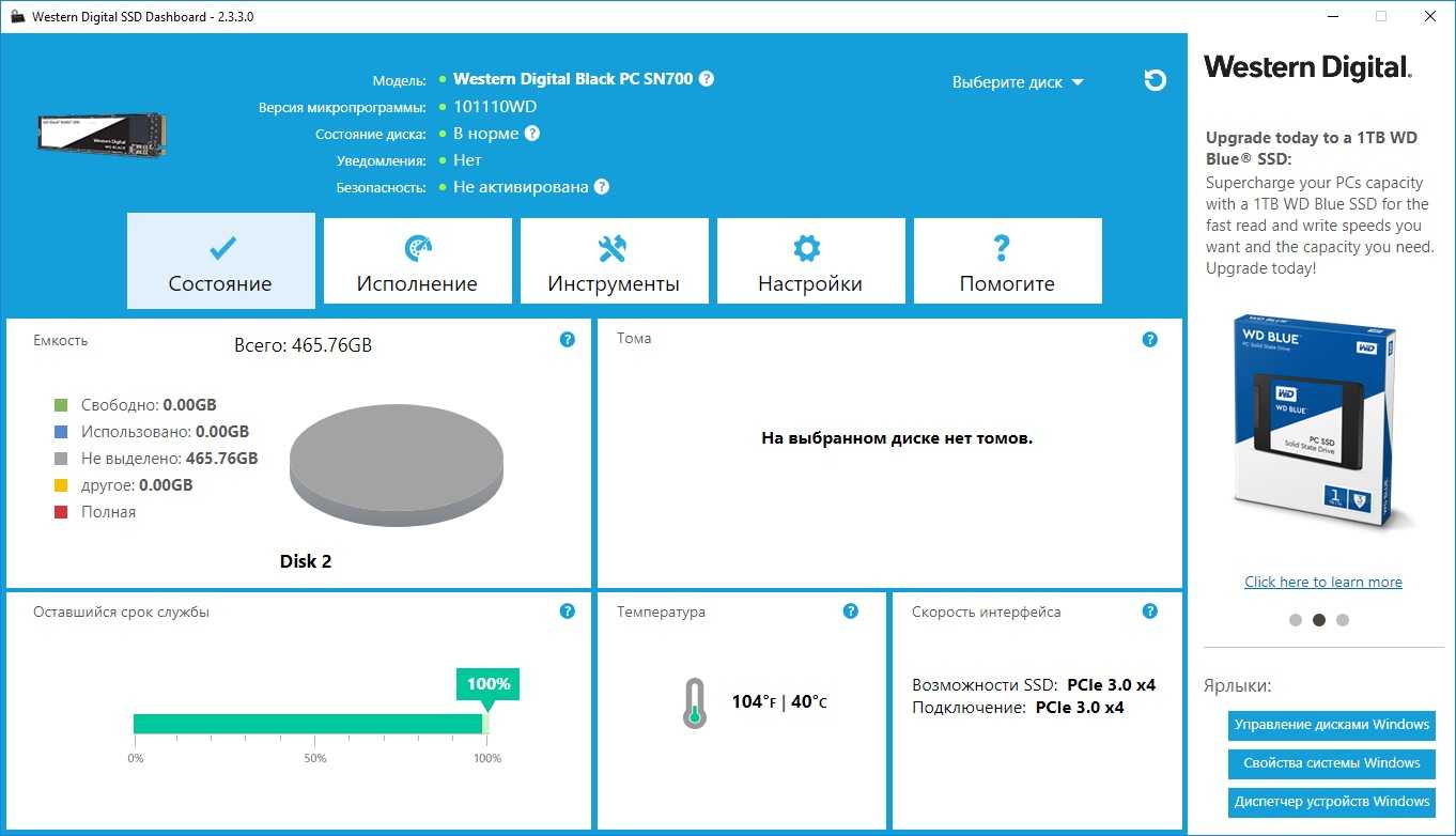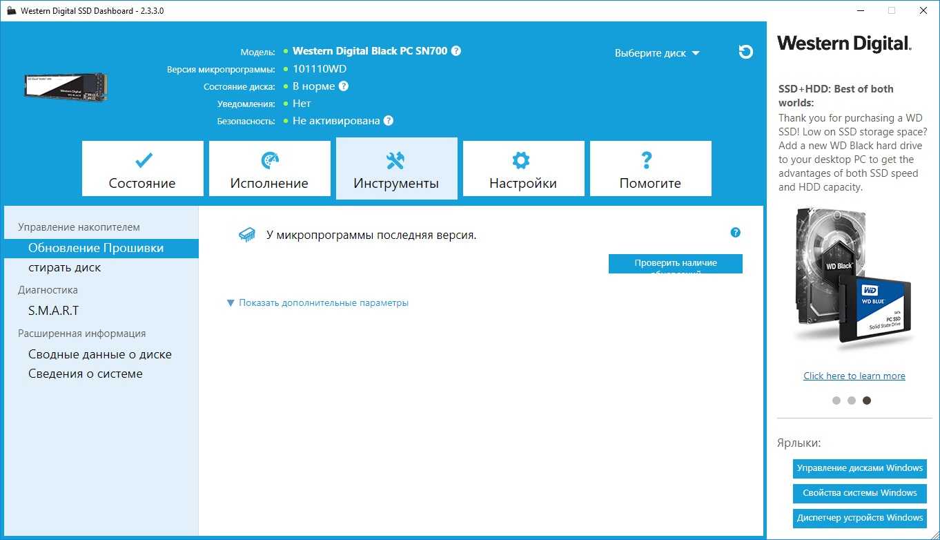 Служебную информацию о диске можно посмотреть с помощью программы Crystal Disk Info. Либо необходимо использовать фирменное ПО – «Панель мониторинга SSD-накопителей Western Digital», которая позволяет просмотреть информацию о накопителе, а также служит для обслуживания и проверки работоспособности SSD-накопителя.