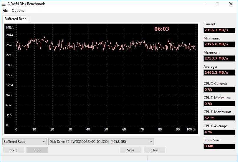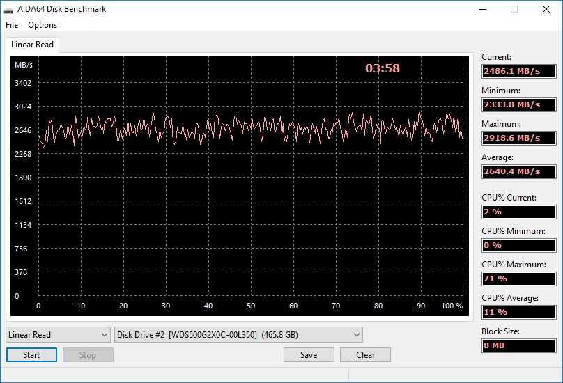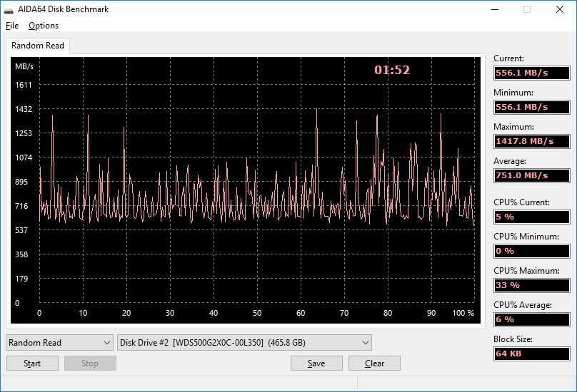 Так как от SSD мы в первую очередь ждем высокой скорости считывания, повторим исследование посредством соответствующего теста в AIDA64 Disk Benchmark. Последовательное чтение блоков объемом 8 мегабайтов и рандомное считывание блоков в 4 килобайта демонстрируют отличное быстродействие.