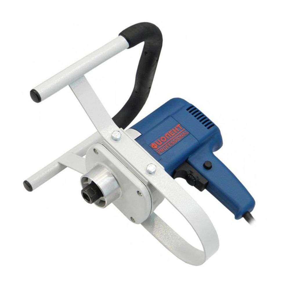 Инструмент отечественной разработки, справляется с большими объемами растворов, за одну процедуру смешивает до 120 л. Металлический редуктор имеет две скорости, двигатель не нагревается в процессе длительной работы. Оснащен многими полезными функциями, включая плавный пуск, фиксатор кнопки запуска, регулятор скорости вращения. С легкостью замешивает бетон, клей, шпатлевку, церезит и другие сухие строительные смеси. Во время работы ручки не перегреваются, создавая максимальный комфорт и безопасность.