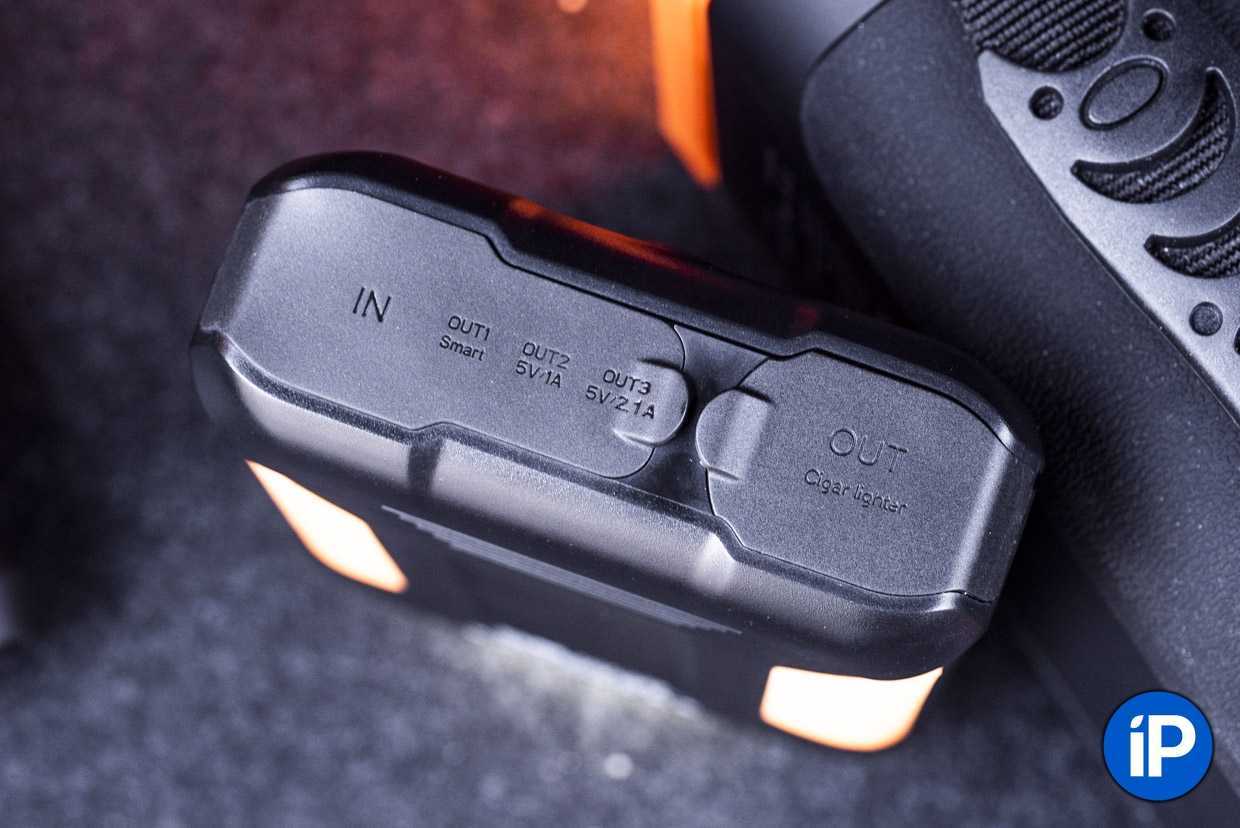 Все порты расположены на одной стенке сзади. На выход здесь автомобильная зарядка мощностью 180 Вт и 3 USB на 5 Вт, 10 Вт и 12 Вт. При этом получится заряжать сразу несколько устройств через разные разъёмы.